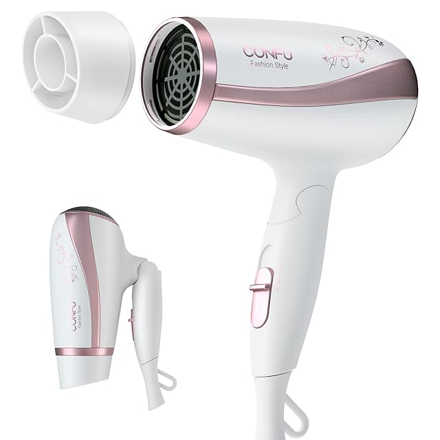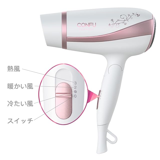 ドライヤー 1200W ヘアドライヤー マイナスイオン CONFUの折りたたみ式ヘアドライヤーは、1200Wの大風量で髪を速乾させることができます。3段階の温風調節機能と静音設計により、快適な使用感を実現しています。マイナスイオン機能で髪のパサつきを防ぎ、ヘアケアにも役立ちます。過熱防止機能も備えており、安心して使用できます。付属のノズルを使えば、ヘアスタイリングにも便利です。