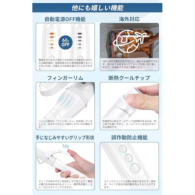 【他にも嬉しい機能】❶使用中もつれや絡まりにくい360度回転コードを採用します。❷自動電源OFF機能搭載で、電源を切り忘れて場合でも約60分で自動的にOFFになる。❸170mmロングバレルは、ロングの人や毛量が多い人も巻きやすい。