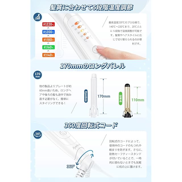 【他にも嬉しい機能】❶使用中もつれや絡まりにくい360度回転コードを採用します。❷自動電源OFF機能搭載で、電源を切り忘れて場合でも約60分で自動的にOFFになる。❸170mmロングバレルは、ロングの人や毛量が多い人も巻きやすい。