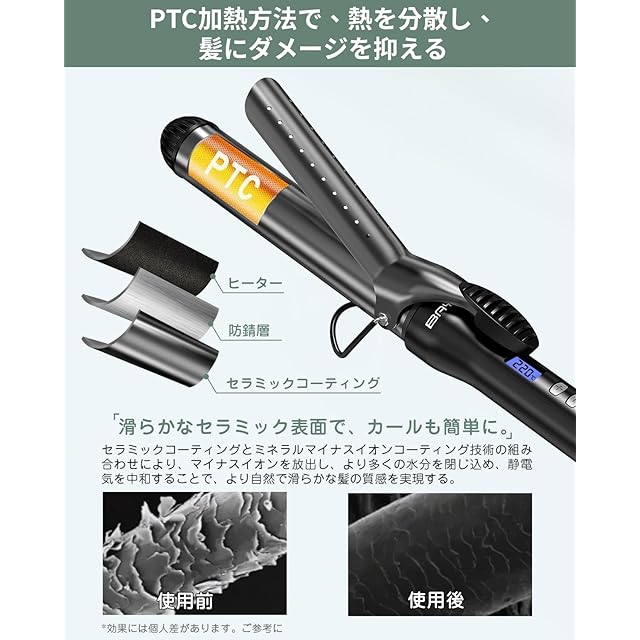 【デジタル温度表示&360度回転式&長めコード】カールアイロンにデジタル温度表示付き、現在の温度を素早く把握することができる。「+/-」ボタンを長押しで希望の温度を素早く設定でき、短押しで温度を小刻みに調整、最低温度100℃から最高温度220℃まで設定可能。360度回転式で使用中のコードのもつれや絡まりを防ぎます。さらに、約2m長めの電源コード、場所を問わずにお使いいただけます。