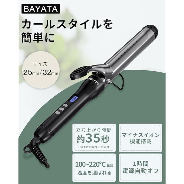 商品名:《新品未開封》BAYATA ヘアアイロン カールアイロン コテ 32mm 巻き髪 カーラー 25段階温度調整 MAX220℃ デジタル温度表示 自動電源OFF 海外対応 PSE認証済み 日本語説明書付き