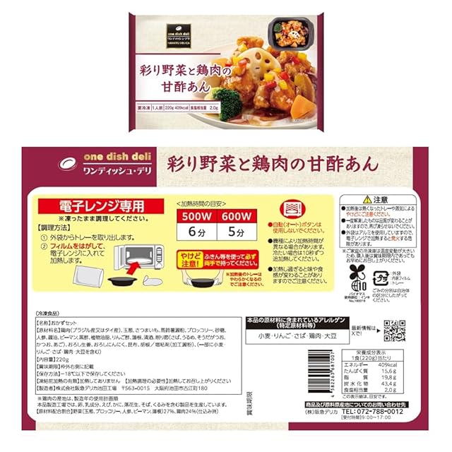 【彩り野菜と鶏肉の甘酢あん】熱量:409kcal たんぱく質:15.6g 脂質:19.8g 炭水化物:43.4g 食塩相当量:2.0g