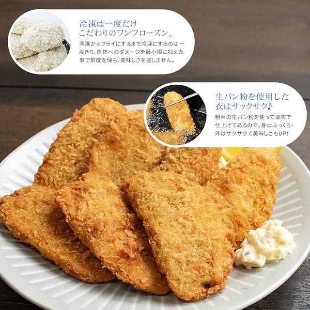 簡単便利!冷凍のまま揚げるだけ!鮮度抜群のお刺身用真あじを贅沢にフライにしました。ワンフローズンだから魚の美味しさがしっかり味わえます。衣には生パン粉を使用し、外はサクサク・中はふんわりジューシー。三枚におろしてあるので、お子様やご年配の方でも食べやすいサイズのアジフライです。