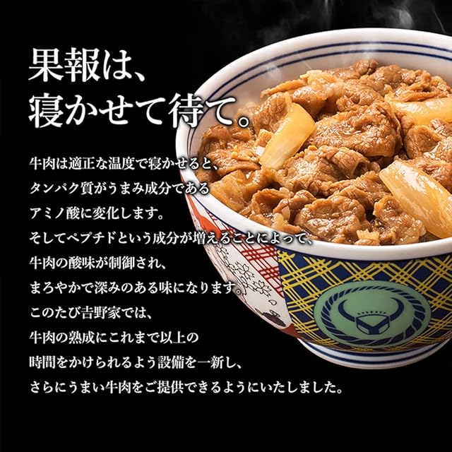 【秘伝のタレ】まろやかさとキレのある秘伝のタレは原料一つひとつを見直し、何度も試作を重ねて吟味しました。ワインを増量し、たれ全体のまろやかさ、香りを高めました。ジンジャーは生のすりおろしに変更し、たれにキレが出てすっきりとした味わいにしました。低温熟成でさまざまな原料を加熱することなく、時間をかけて熟成させていてる吉野家の『タレ』は喉から鼻に抜ける香りが今まで以上に香ばしくなっています。