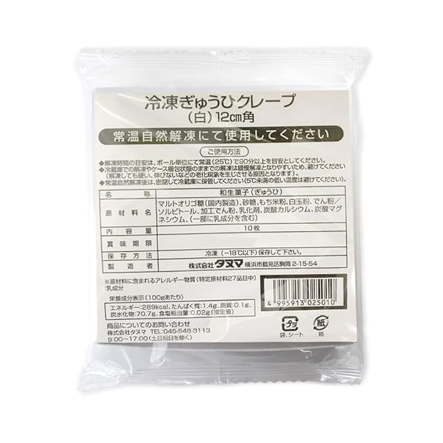 商品名:《新品未開封》冷凍ぎゅうひクレープ(白) 12cm角 タヌマ 35g×10 求肥