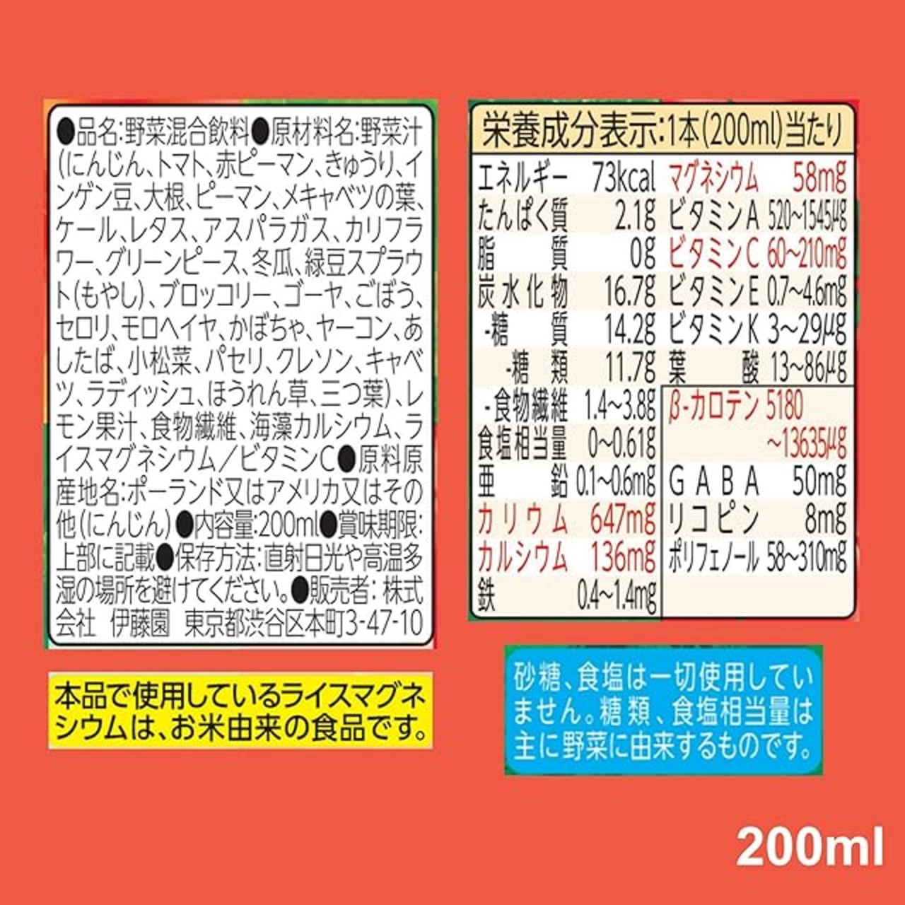 栄養成分(1本(200ml)当たり):エネルギー:73kcal、たんぱ:質 2.1g、脂質:0g、炭水化物:16.7g(糖質:14.2g (糖類:11.7g)、食物繊維:1.4~3.8g)、食塩相当量:0~0.61g、亜鉛:0.1~0.6mg、カリウム:647mg、カルシウム:136mg、鉄:0.4~1.4mg、マグネシウム:58mg、ビタミンA:520~1545μg、ビタミンC:60~210mg、ビタミンE:0.7~4.6mg、ビタミンK:3~29μg、葉酸:13~86μg、β-カロテン:5180~13635μg、GABA:50mg、リコピン:8mg、ポリフェノール:58~310mg※砂糖・食塩は一切使用していません。糖類、食塩相当量は主に野菜に由来するものです。