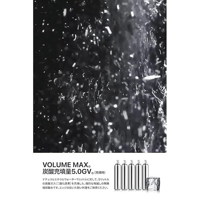 【強炭酸水】「VOLUME MAX。炭酸充填量5.0GV。」強烈な喉越しの無糖強炭酸水です。エッジの効いた鋭い刺激をご体験ください。