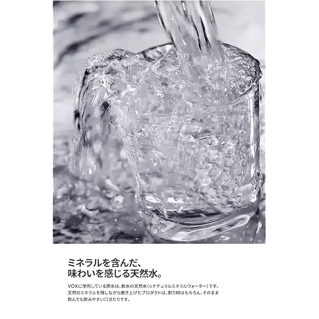 【VOXは全て、天然水を使用 】VOXに使用している原水は、日本国内産の軟水の天然水(ナチュラルミネラルウォーター)です。ミネラル分を残しながら磨き上げたプロダクトは、割り材はもちろん、そのまま飲んでも飲みやすい口当たりです。