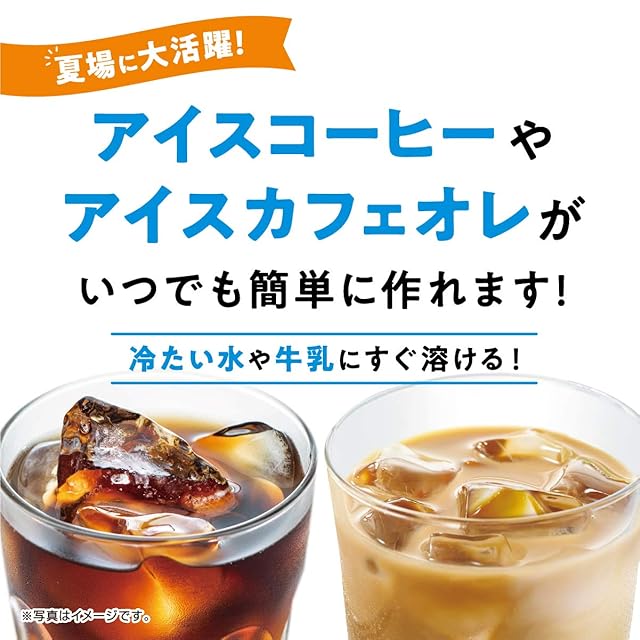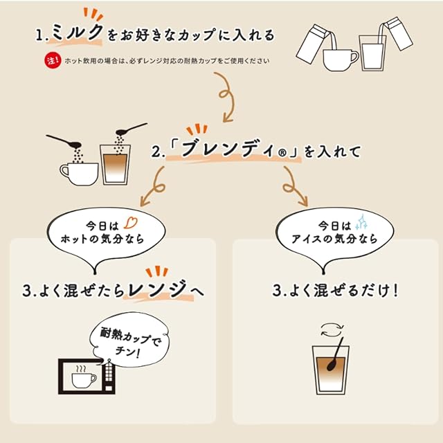 おいしい飲み方:【ホットカフェオレ】:1.耐熱カップにミルクを入れます。2.ティースプーン山盛り1杯を入れ、よくかきまぜます。3.レンジで1分20秒温めてください。※ホットコーヒーの場合はお湯を入れ、かきまぜてください【アイスカフェオレ】:1.グラスに冷たいミルクを入れます。2.ティースプーン山盛り1杯を入れ、よくかきまぜます。※アイスコーヒーの場合は冷たい水を入れ、よくかきまぜてください