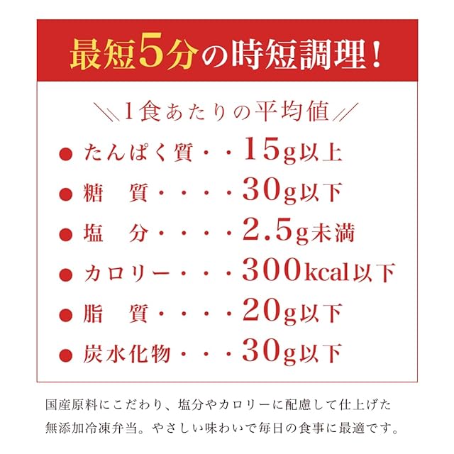 栄養バランスに配慮: 1食あたり平均 たんぱく質15g以上、糖質30g以下、塩分2.5g以下、300kcal以下、脂質20g以下。(※製造時の目安値です)