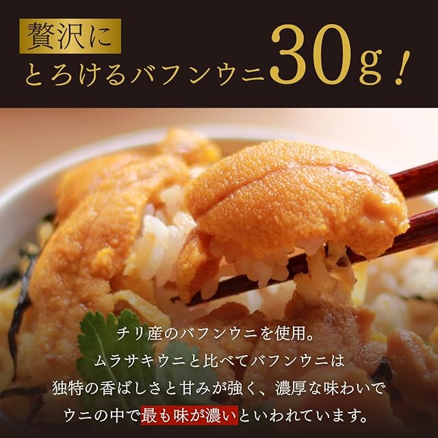 チリ産のバフンウニを使用。ムラサキウニと比べてバフンウニは独特の香ばしさと甘みが強く、濃厚な味わいでウニの中で最も味が濃いといわれています。