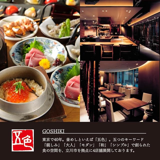 東京で40年。釜めしといえば「五色」。五つのキーワード 親しみ」「大人」「モダン」「和」「シンプル」で創られた 食の空間を、立川市を拠点に4店舗展開しております。