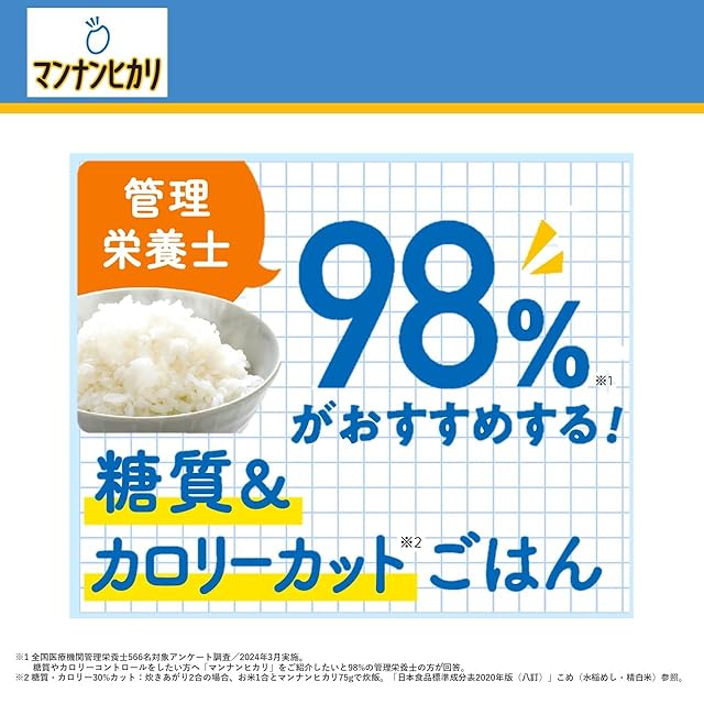 糖質・カロリー30%カット:炊きあがり2合の場合 お米1合とマンナンヒカリ75gで炊飯。「 日本食品標準成分表2020年版(八訂)」こめ(水稲めし、精白米)参照
