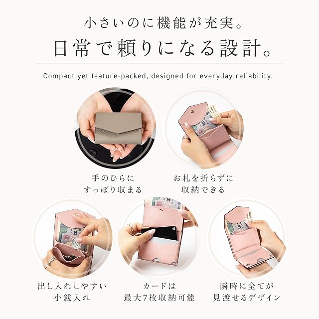 【使えば使うほど愛せる財布】 <br>一度使えば手放せない。 手のひらにすっぽり収まるジャストサイズなミニ財布。 コンパクトなので小さなバッグでもスッキリ収納。 毎日使いたくなる お洒落な貴方にピッタリな財布です。 <br> <br> 【揺るがない美しさと機能】 <br>様々なシーンでも違和感なく使える万能デザイン。 お札は折らずに収納でき、小銭も必要なカードも入る万能 三つ折り財布。 カード収納最大7枚やレシートを入れるポケットも充実! 紙幣なら20枚・小銭は20枚も収納できる抜群の収納力。 <br> <br> 【傷や汚れに強いシボ本革】 <br> 柔らかい感触が手に馴染みとっても使いやすく持ちやすい。 厳選された上質な本革を採用し、傷・汚れに強いシボ加工を施しています。 上品で高級感溢れる美しさと素材の強さを兼ね備えたミニ財布。 <br> <br> 【ワンアクションでスムーズに会計】 <br> パッと開けて大きく開くので小銭の出し入れもスムーズ。 お札は横にスライドすれば簡単に取り出せます。 シンプル設計ながら、使いやすさを追求したお札入れです。 小銭入れは大きく開き、取り出しやすく使い勝手抜群。 <br> <br> 【魅力あふれるバイカラー】 <br> 色のコントラストが生み出す印象的な美しさ 上質で鮮やかな色合いがとってもお洒落。 ・エトーブxイエロー ・グレージュxピンク ・アイボリーxライトブルー <br> <br> 【ギフトにも喜ばれるオリジナル巾着入り】 <br> 大切な方に贈るプレゼントにも最適です。 専用オリジナル巾着は小物入れとしても使えます。 <br> <br> ■【サイズ】約縦7.5cm 横9.5cm 厚み2.5cm 【重量】約60g 【仕様】カードポケットx3(最大7枚収納可能)、お札入れ、小銭入れ【素材】本革 【カラー展開】全3色 <br> <br>※化粧袋のデザインが変更される場合がございます。予めご了承ください。