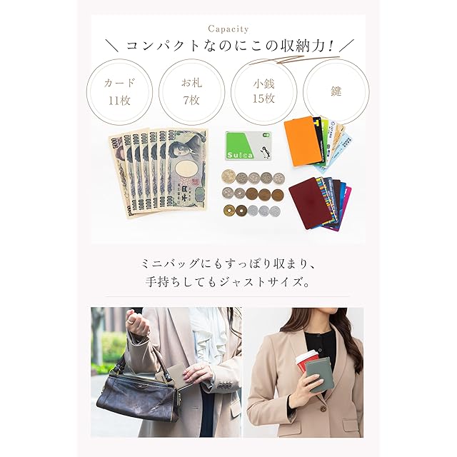 【サイズ(約)】縦10.3cm 横8cm 厚さ3cm【重量(約)】93g【ポケット】外側:カードポケットx1 内側:カードポケットx9、フリーポケットx2、お札入れx1、小銭入れx1【材質】外側:牛本革(シボ) 内側:マイクロファイバー ※お使いのスマートホンやパソコンの画面設定や色調補正により、色合いに違いが出る場合がございます。予めご了承ください。