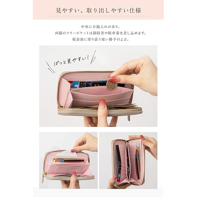 【見やすい、取り出しやすい仕様】 中央に小銭入れがあり、両脇のフリーポケットは領収書や駐車券を差し込めます。現金派のあなたも満足できる使い勝手の良さ。
