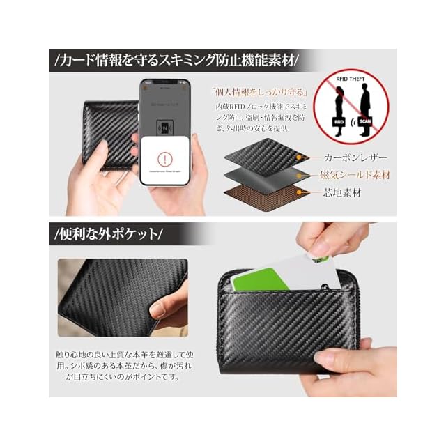 【スキミング防止機能】内側のじゃばら1枚1枚に磁気干渉防止素材(RFIDブロック素材)が入っており、カード同士の接触による磁気不良を防止します。また、近年増加しているスキミング犯罪から大切な個人情報を守る「RFIDブロック機能」でセキュリティ対策を施しています。外側の定期券スペースはブロックの外なので自動改札OKです!