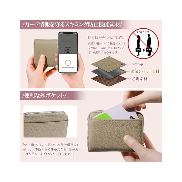 【スキミング防止機能】内側のじゃばら1枚1枚に磁気干渉防止素材(RFIDブロック素材)が入っており、カード同士の接触による磁気不良を防止します。また、近年増加しているスキミング犯罪から大切な個人情報を守る「RFIDブロック機能」でセキュリティ対策を施しています。外側の定期券スペースはブロックの外なので自動改札OKです!