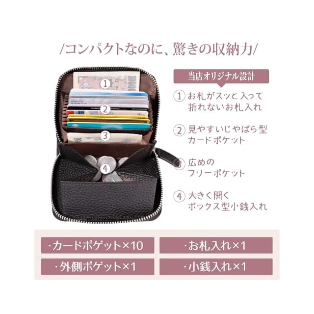 【細部までこだわったデザイン設計】コンパクトなボディに、使いやすさのための工夫を詰め込みました。出し入れ簡単マチ付きお札入れ! じゃばら式カードポケットでたっぷり大容量。ラウンドファスナーを開けば180度広がるので、使いたいカードが一目瞭然。