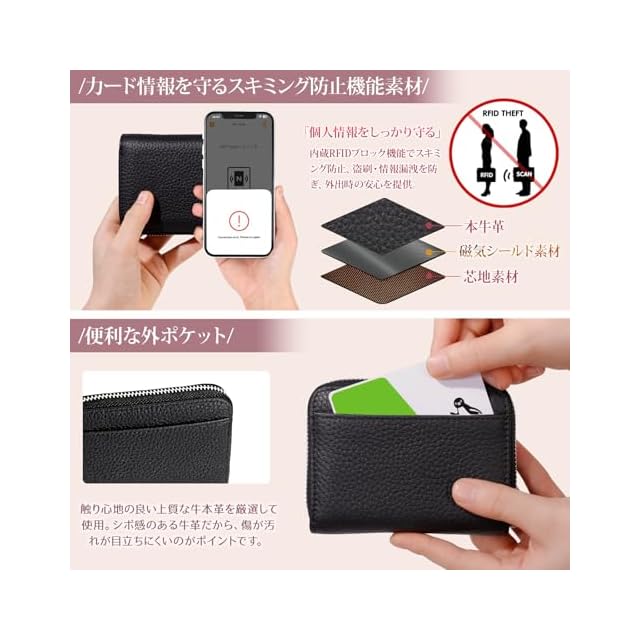 【スキミング防止機能】内側のじゃばら1枚1枚に磁気干渉防止素材(RFIDブロック素材)が入っており、カード同士の接触による磁気不良を防止します。また、近年増加しているスキミング犯罪から大切な個人情報を守る「RFIDブロック機能」でセキュリティ対策を施しています。外側の定期券スペースはブロックの外なので自動改札OKです!