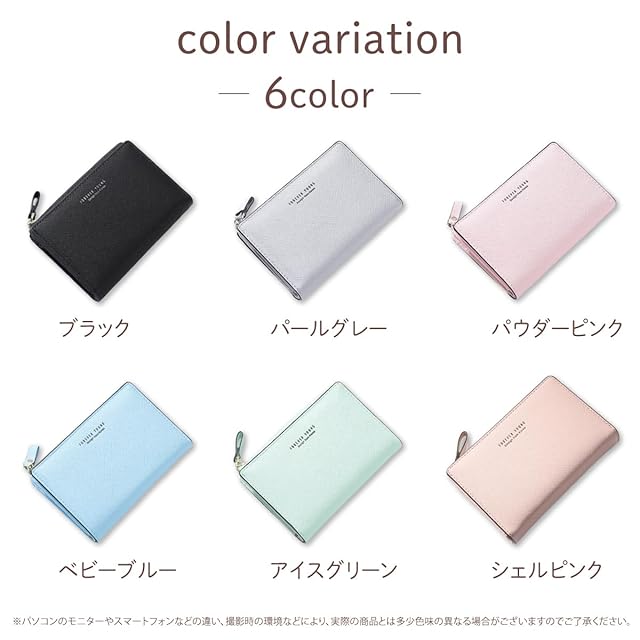 【サイズ】約横14cm × 縦9.5cm × 幅3.0cm ※手作業での採寸のため、多少の誤差がある場合がございます。 【カラー】ブラック・パールグレー・パウダーピンク・ベビーブルー・アイスグリーン・シェルピンク ※パソコンのモニターやスマートフォンなどの違い、撮影時の環境などにより、実際の商品とは多少色味の異なる場合がございますのでご了承ください。 【素材】合成皮革(PUレザー) 【仕様】二つ折りタイプ お札入れ×1 ファスナー小銭入れ(仕切り×2、さらに内部にファスナー付きポケット)×1 カード入れ×10枚分