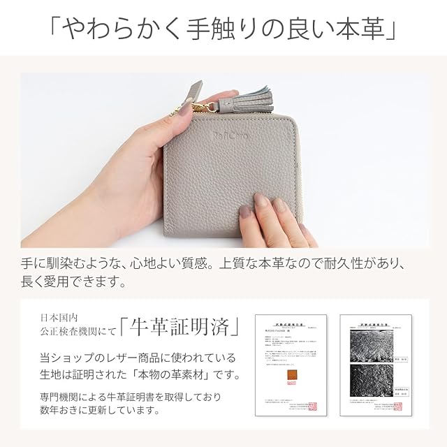 【手触りの優しい本革仕様】 表地には上品なシボ感が魅力の牛本革を贅沢に使用しています。同素材で仕上げたタッセルはお好みで付け外しOK。小さめバッグやポケットにも収まるサイズ感は、メイン財布にもサブ財布にもお勧めです。