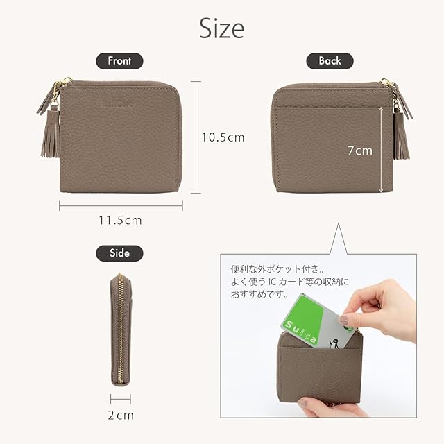 【ブランド】 RafiCaro - ラフィカロ - 【品番】 a74109 【スペック】 ・小銭入れ × 1 ・カードポケット × 6 ・フリーポケット × 2 ・フリースペース × 1 ・外ポケット × 1 【サイズ】 ・縦 105mm × 横 115mm × 厚み 20mm ・重さ 80g 【素材】 ・表側:本革 ・内側:PUレザー 【お会計をスムーズに】 L字ファスナーを開くと、カード・小銭・お札のすべてにアクセスできるこだわり設計。充実のカードポケットに、技ありマチで大きく開く小銭入れ。お札は折らずに小銭入れの下を通して収納したり、二つ折りで左右に仕分けることも可能です。 【手触りの優しい本革仕様】 表地には上品なシボ感が魅力の牛本革を贅沢に使用しています。同素材で仕上げたタッセルはお好みで付け外しOK。小さめバッグやポケットにも収まるサイズ感は、メイン財布にもサブ財布にもお勧めです。 人気の10カラーをラインナップ。かわいい、おしゃれ、クール、カジュアル、ビジネス、フォーマルなどスタイルに合わせてお選び頂けます。 記念日 などの プレゼント 母の日 バレンタインデー ホワイトデー 誕生日 クリスマス 等の ギフト にも おすすめ です。dustypink ダスティピンク / greige グレージュ / green グリーン / black ブラック / orange オレンジ / lavender ラベンダー / dustyblue ダスティブルー / lightgrey ライトグレー