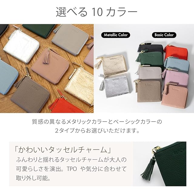 【ブランド】 RafiCaro - ラフィカロ - 【品番】 a74109 【スペック】 ・小銭入れ × 1 ・カードポケット × 6 ・フリーポケット × 2 ・フリースペース × 1 ・外ポケット × 1 【サイズ】 ・縦 105mm × 横 115mm × 厚み 20mm ・重さ 80g 【素材】 ・表側:本革 ・内側:PUレザー 【お会計をスムーズに】 L字ファスナーを開くと、カード・小銭・お札のすべてにアクセスできるこだわり設計。充実のカードポケットに、技ありマチで大きく開く小銭入れ。お札は折らずに小銭入れの下を通して収納したり、二つ折りで左右に仕分けることも可能です。 【手触りの優しい本革仕様】 表地には上品なシボ感が魅力の牛本革を贅沢に使用しています。同素材で仕上げたタッセルはお好みで付け外しOK。小さめバッグやポケットにも収まるサイズ感は、メイン財布にもサブ財布にもお勧めです。 人気の10カラーをラインナップ。かわいい、おしゃれ、クール、カジュアル、ビジネス、フォーマルなどスタイルに合わせてお選び頂けます。 記念日 などの プレゼント 母の日 バレンタインデー ホワイトデー 誕生日 クリスマス 等の ギフト にも おすすめ です。dustypink ダスティピンク / greige グレージュ / green グリーン / black ブラック / orange オレンジ / lavender ラベンダー / dustyblue ダスティブルー / lightgrey ライトグレー