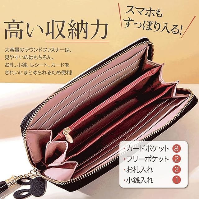 ♥カードポケット8箇所、お札入れ4箇所、ファスナー付きコイン入れ&小銭入れ1箇所、スマホ入れ可能。高級感を感じながら長くお持ち頂けます。