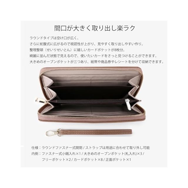 ♥おしゃれで収納性の高いラウンドファスナー長財布。カード入れ8箇所、大きめの紙幣入れ3箇所、フリーポケット2箇所、外ポケット1箇所、小銭入れ1箇所、スマホ入れ可能。