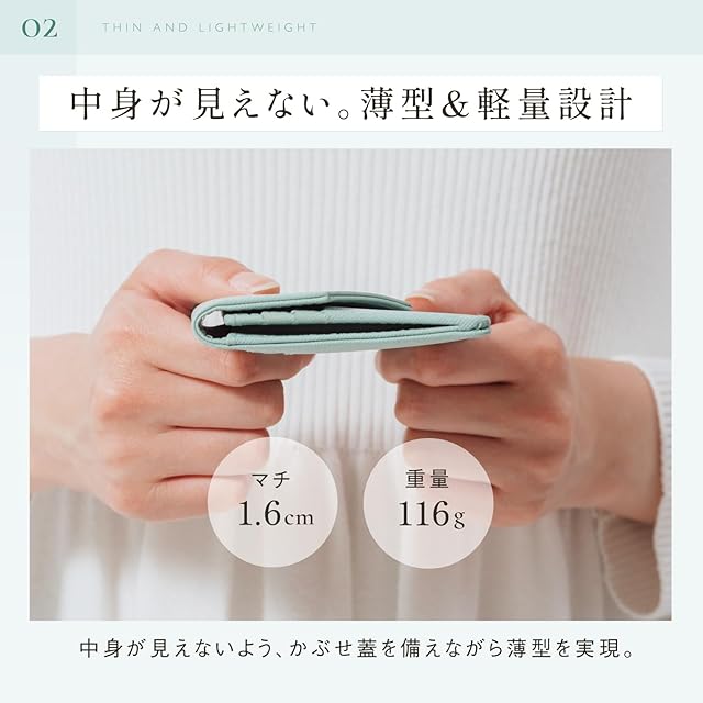 スリムな見た目以上の収納 長財布で気になりがちな厚さは最小限に抑えながら、カード入れ6箇所、お札入れ1箇所、小銭入れ1箇所のスリムな見た目以上の収納。 日常遣いやセカンド財布にちょうどいい薄型長財布。