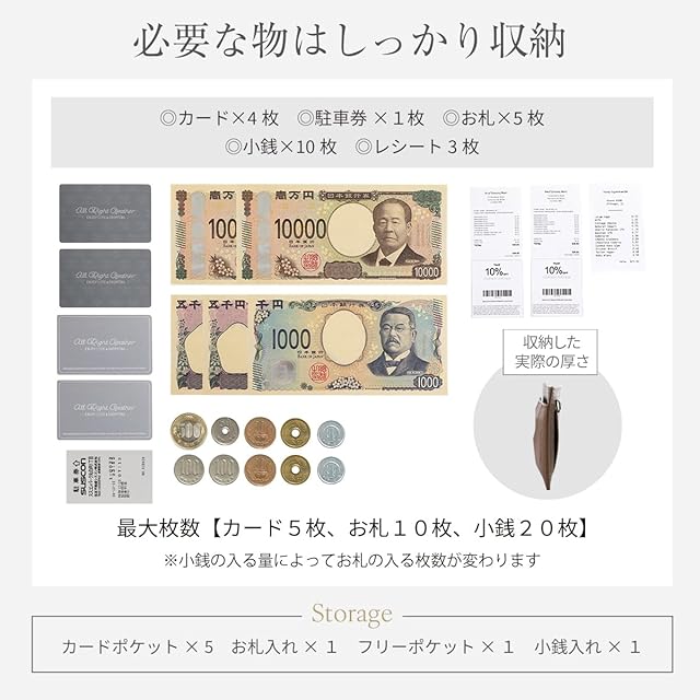 【スペック】 ・小銭入れ × 1 ・お札入れ × 1 ・フリーポケット × 1 ・カードポケット × 5 【サイズ】 ・縦 130mm × 横 88mm × 厚み 10mm ・重さ 50g 【素材】 ・表地:本革 ・裏地:PUレザー/ナイロン