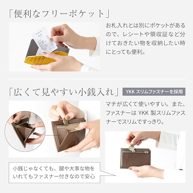 【小さくてもしっかり収納】 キャッシュレス決済がメインだけど現金も持ち歩きたい…かさばらないお財布がほしい...そんな方にぴったりなミニ財布です。薄型でもカードは安心の5枚収納。小銭入れは片側マチで大きく開きます。YKKファスナーでスライダーもスムーズです。