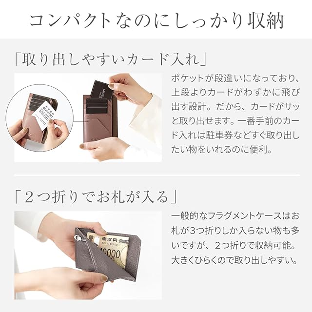 【ブランド】 RafiCaro - ラフィカロ - 【品番】 a74079 【スペック】 ・小銭入れ × 1 ・お札入れ × 1 ・フリーポケット × 1 ・カードポケット × 5 【サイズ】 ・縦 130mm × 横 88mm × 厚み 10mm ・重さ 50g 【素材】 ・表地:本革 ・裏地:PUレザー/ナイロン 【小さくてもしっかり収納】 キャッシュレス決済がメインだけど現金も持ち歩きたい…かさばらないお財布がほしい...そんな方にぴったりなミニ財布です。薄型でもカードは安心の5枚収納。小銭入れは片側マチで大きく開きます。YKKファスナーでスライダーもスムーズです。 【上品なバイカラー】 こだわりの色合わせで程良く主張のあるバイカラー。手触りがよく、柔らかなシボ感の牛本革を使用しました。専用化粧箱に入れてお届けしますので、そのままギフトとしてもお使いいただけます。 人気の5カラーをラインナップ。かわいい、おしゃれ、クール、カジュアル、ビジネス、フォーマルなどスタイルに合わせてお選び頂けます。 記念日 などの プレゼント 母の日 父の日 バレンタインデー ホワイトデー 誕生日 クリスマス 等の ギフト にも おすすめ です。pink/brown ピンク/ブラウン・yellow/grey イエロー/グレー・grey/lavender グレー/ラベンダー・blue ブルー・green グリーン