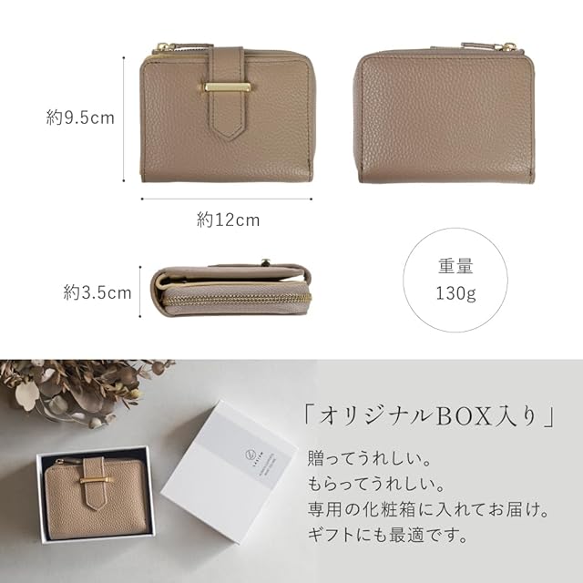 【商品説明】「牛本革をふんだんに使った 永く愛せる二つ折り財布」女性の手にすっと収まる絶妙なサイズ感と使いやすさ。外側だけでなく内側にも贅沢に牛本革を使用することで 開いた時の華やかさ、しっとりなじむ手触りを実現しました。キラッと光るフロントの金具のデザインやファスナー、 毎日使うからこそこだわりを詰め込みました。■牛本革×バイカラー■小さいのに大容量■ガバッと開く小銭入れ■仕切り付きお札入れ■スキミング防止■オリジナルBOX付き■ずっと触れていたい 美しいシボレザー。 しっとりなめらかな手触りの 牛本革を贅沢に使いました。 丈夫で傷が目立ちにくいので 永く愛用いただけます。■小入れの内側にも シボレザーを採用。使うほどにエイジングが進み、唯一無二の魅力を放ちます。■小さいバッグにもラクラク収納■小さいのに大容量カードポケット×10 小銭入れ×2 お札入れ×2 長財布並みの収納力◎整理しやすく、収納しやすい財布を目指しました。■「取り出しやすい小銭入れ」 ガバッと開いて見やすいので、 レジ前でもたつかずスマートにお会計ができます。Point 自宅の鍵やお守りの収納にも ■「仕切り付きお札入れ」自分用・家計用 仕切りで分けて 家計管理にも!お札の他に、レシートやチケットを 仕切りで整理しながら収納できます。■「スキミング防止機能」大切なカードの情報を外部から守ります。■「オリジナルBOX入り」贈ってうれしい。 もらってうれしい。専用の化粧箱に入れてお届け。 ギフトにも最適です。【サイズ】高さ 約9.5㎝ 横幅 約12㎝ 厚さ 約3.5㎝ 【重量】約130g【素材】牛本革 金具・ファスナーカラー:ゴールド