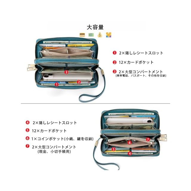 【ダブルジップデザイン】財布 レディースには2つの独立したファスナー仕切りがあり、必需品を整理するための最大のスペースを提供します。24枚のカードケース(各種クレジットカードを収納可能)、4枚のお札入れ(現金、領収書または手形を収納可能)、4枚の全長内側仕切り(現金、小切手帳または携帯電話を収納可能)、1枚のファスナーポケット(小銭と硬貨を収納可能)。