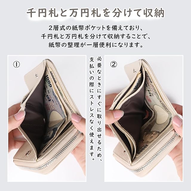 【ボックス型小銭入れと豊富なカラー】ボックス型のコインポケットは、硬貨を20~30枚しっかり収納できる設計です。硬貨を取り出しやすく、小銭の管理が簡単になります。また、ブラック、アイボリー、グレー、マカロンピンク、水色、アボカドグリーン、コーヒー、草色、虹色と、豊富なカラーバリエーションを取り揃えており、性別や年齢を問わず、あらゆるシーンで活躍します。