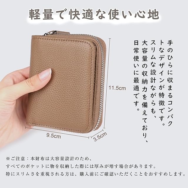 【コンパクトながら大容量】サイズは11.5cm×9.5cm×3.5cmで、手のひらに収まるコンパクトなデザインです。大容量ながらもスリムな設計で、普段使いに最適なサイズ感です。※ご注意:すべてを収納した際には厚みが増すことがあるため、特にスリムさを求める方は事前にご確認ください。