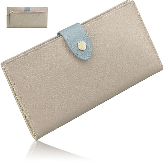 《新品未開封》[アンコール] 長財布 【 極薄 7mm】 薄型 財布 レディース 本革 薄い 軽い スリム コンパクト 小銭入れ キャッシュレス レザー ウォレット スキミング防止 RFID ギフト (グレージュ×アイスブルー)