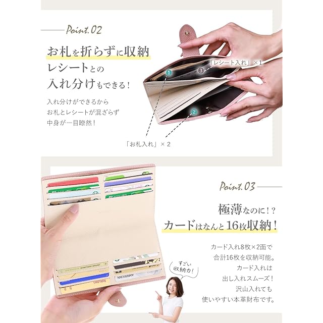 ✅【薄型なのに大容量】 カード16枚、レシート、お札、小銭までしっかり収納。外側の小銭ポケットはマチ付きで取り出しやすく、お札は折らずにスムーズに収納可能です。