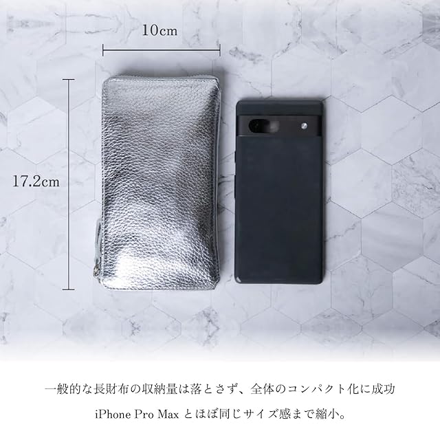 一般的な長財布の収納量は落とさず、全体のコンパクト化に成功。iPhone Pro Maxとほぼ同じサイズ感まで縮小。