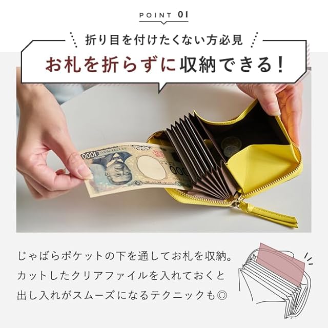 お札を二つ折りにして収納してもファスナーに 引っ掛かることなくスムーズに開け閉めできます。 お札を折りたくない方にはじゃばらポケットの下に スーッと通して、折らずに収納することも可能です! 小銭入れはボックス型で中身が一目瞭然! お会計のときもスムーズに出し入れできます。
