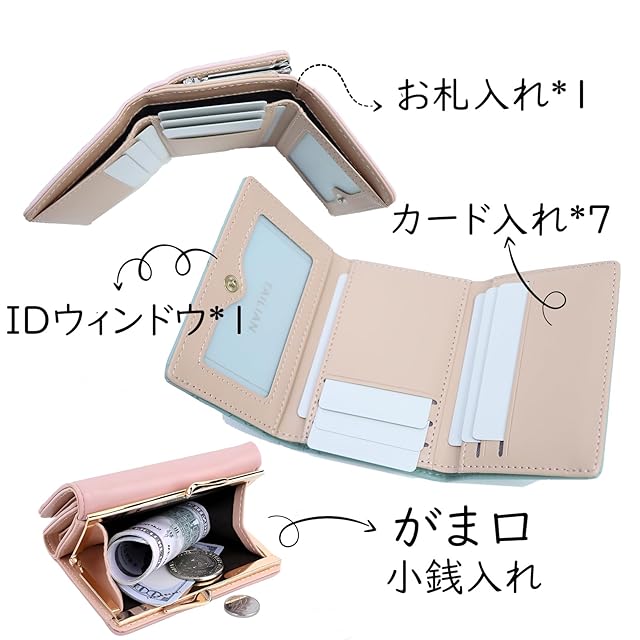 【三つ折り財布】ミニ財布ですが大容量です。 折り畳み財布で、お札がおらずに入れます。がま口で開閉する小銭入れ部分と、ボタンで開閉するお札、カード入れ部分があります。お札入れ*1、IDウィンドウ*1 、カード入れ*7、小銭入れ*1。