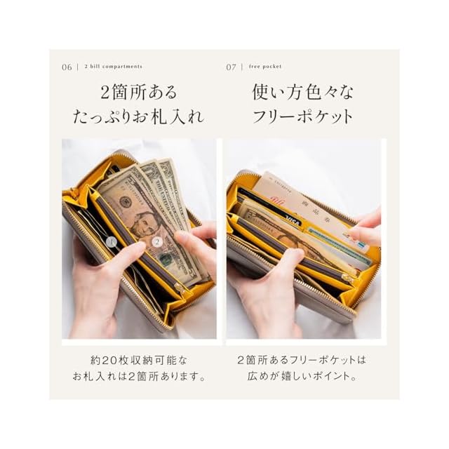 ✅【高級感溢れるラウンドゴールドファスナー付きで中身を隠す】お財布の中身を他人に見られるのは抵抗ある、、、そう感じる人にも、ファスナー付きなら安心♪ おしゃれで滑らかなゴールドファスナーで中身を見られることがありません。 カードやお札などの紛失防止にも◎✅【小銭入れファスナーは日本製YKKファスナー】小銭入れファスナーにもこだわり日本製のYKKファスナーを使用しております。 滑らかなのはもちろん小銭入れ部分は折りたたんで隠せるようになっておりちょっとした気遣いも。✅【裏地には耐久性のあるシャンタン生地】小銭入れやお札入れなどの内部の裏地には強度のあるシャンタン生地を使用。 末永く安心してご使用いただけます。