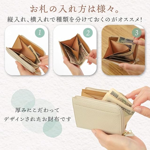 ■商品詳細■<br> <br> 【素材】<br> ・本革(牛革シボ)<br> <br> <br> 【サイズ】<br> (閉じた状態)<br> ・縦:約9.5cm<br> ・横:約12cm<br> ・幅:約1.5cm<br> <br> (タッセルなしの状態)<br> ・重さ:約70g <br> ※本革製のため個体差があります。<br> <br> <br> 【カラーバリエーション】<br> ・アイボリー<br> ・ライトベージュ<br> ・ライトブルー<br> ・トープ<br> ・ライトグリーン<br> ・ブラック<br> ・ライトピンク<br> <br> <br> ■特長■<br> 【牛本革を使用】<br> ・ふんわり柔らかな手触りの牛革シボを使用した二つ折り薄財布です。<br> <br> 【コンパクトで使いやすい】<br> ・厚みにこだわり不要なパーツを出来るだけ無くしたコンパクトで使いやすいデザインです。<br> <br> 【デイリー使いに便利】<br> ・お札入れと小銭入れ、カード入れも豊富で普段使いにも十分な容量です。<br> 薄型、軽量でスマートに持ち歩きが出来ます。<br> <br> 【豊富なカラーバリエーション】<br> ・落ち着いたおしゃれなくすみカラー。お好みで選べる7色をご用意。<br> <br> 【安心のスキミング防止シート使用】<br> ・内カードポケットとフリーポケットは、スキミング防止加工で中のカード情報をしっかり守ります。<br> (外側のカードポケットはスキミング防止がないので、ICタッチができます。)<br> <br> 【取り外し可能なタッセル付き】<br> ・ボディのカラーと同色のおしゃれなタッセル付き。<br> 取り外しが出来るのでバッグや鍵のチャームとしても!<br> <br> <br> ■注意点■<br> <br> ・商品のカラーや素材感は、ご使用のブラウザの設定により、実際の商品のイメージと多少異なる場合がございます。<br> <br> ・生産時期によりデザインが若干異なる場合がございます。予めご了承ください。<br> <br> ・お送りする商品は財布本体のみです。写真にあるカードやお札は付いておりません。<br>