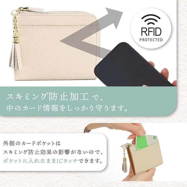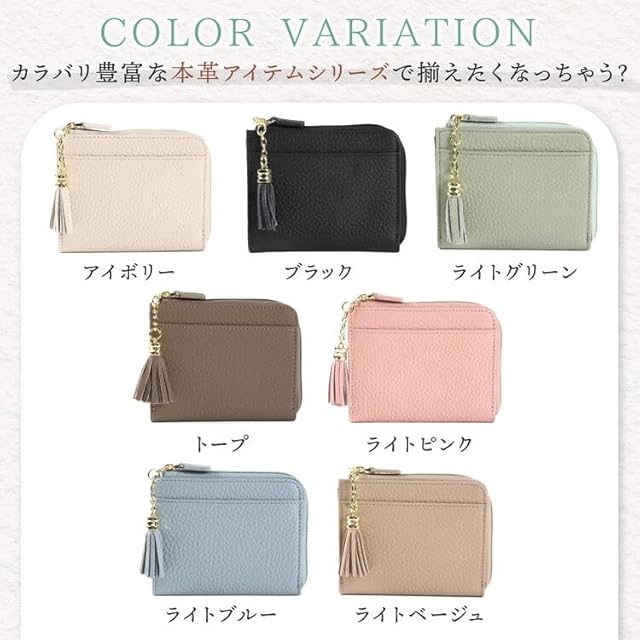 ■商品詳細■<br> <br> 【素材】<br> ・本革(牛革シボ)<br> <br> <br> 【サイズ】<br> (閉じた状態)<br> ・縦:約9.5cm<br> ・横:約12cm<br> ・幅:約1.5cm<br> <br> (タッセルなしの状態)<br> ・重さ:約70g <br> ※本革製のため個体差があります。<br> <br> <br> 【カラーバリエーション】<br> ・アイボリー<br> ・ライトベージュ<br> ・ライトブルー<br> ・トープ<br> ・ライトグリーン<br> ・ブラック<br> ・ライトピンク<br> <br> <br> ■特長■<br> 【牛本革を使用】<br> ・ふんわり柔らかな手触りの牛革シボを使用した二つ折り薄財布です。<br> <br> 【コンパクトで使いやすい】<br> ・厚みにこだわり不要なパーツを出来るだけ無くしたコンパクトで使いやすいデザインです。<br> <br> 【デイリー使いに便利】<br> ・お札入れと小銭入れ、カード入れも豊富で普段使いにも十分な容量です。<br> 薄型、軽量でスマートに持ち歩きが出来ます。<br> <br> 【豊富なカラーバリエーション】<br> ・落ち着いたおしゃれなくすみカラー。お好みで選べる7色をご用意。<br> <br> 【安心のスキミング防止シート使用】<br> ・内カードポケットとフリーポケットは、スキミング防止加工で中のカード情報をしっかり守ります。<br> (外側のカードポケットはスキミング防止がないので、ICタッチができます。)<br> <br> 【取り外し可能なタッセル付き】<br> ・ボディのカラーと同色のおしゃれなタッセル付き。<br> 取り外しが出来るのでバッグや鍵のチャームとしても!<br> <br> <br> ■注意点■<br> <br> ・商品のカラーや素材感は、ご使用のブラウザの設定により、実際の商品のイメージと多少異なる場合がございます。<br> <br> ・生産時期によりデザインが若干異なる場合がございます。予めご了承ください。<br> <br> ・お送りする商品は財布本体のみです。写真にあるカードやお札は付いておりません。<br>