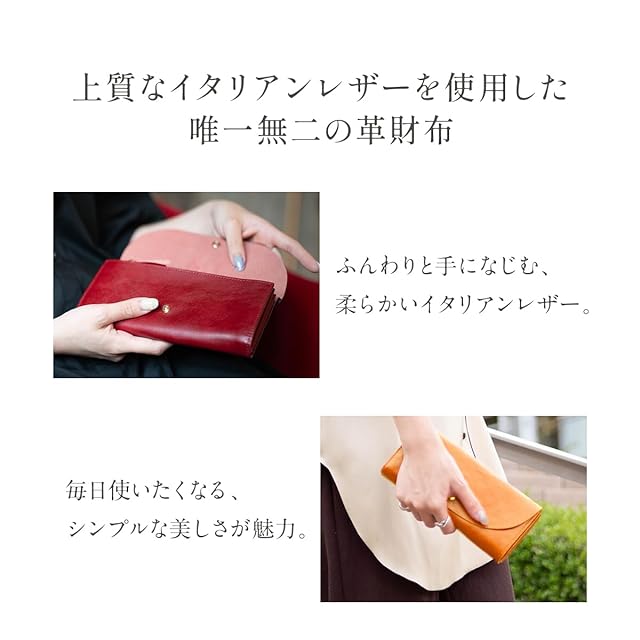 【こだわりのイタリアンレザー】全面にイタリアンレザー、大人の贅沢ロングウォレット。薄くて柔らかいイタリアンレザーを使用しているので、初めて使う瞬間から手に馴染みます。長く使用することでエイジングが進み、より魅力が深まります。