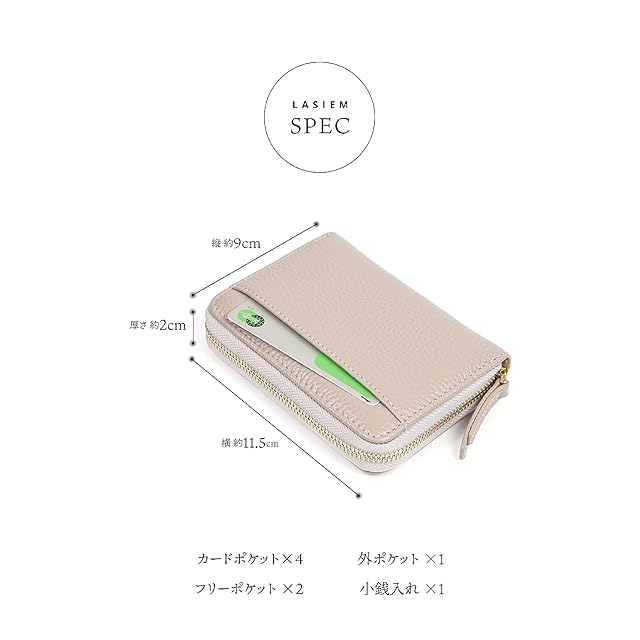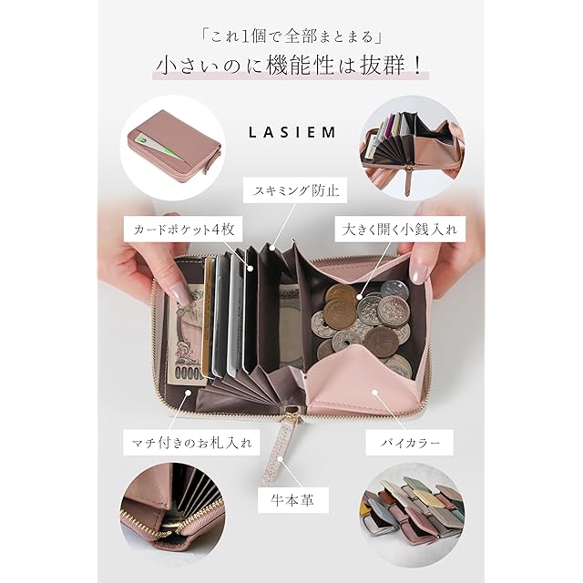 【商品説明】お客様の声を元にNEWタイプが誕生厚み30%減!LASIEMの薄型じゃばらミニ財布■「従来品をご愛用中のお客様の声」・同じ機能でカード入れを減らして、薄く軽くしたお財布が欲しい!・可愛いのですが、思っていたよりも厚さがありました。・もう少し薄くて小さいほうがよかったかも。・カード枚数が多く入れられれる反面、財布が厚くなってしまうのが難点。・欲を言えば、カード収納を減らして薄くなったらいいなと思います。・もう少しカード枚数減らして薄くしたバージョンもあったら良いなあ。そんなお客様の声にお答えして、使いやすさはそのままにリニューアル!■「薄いのに機能性は抜群!」・これ1個で全部まとまる・カード5枚収納可能・マチ付きお札入れ・ボックス型小銭入れ・スキミング防止・バイカラー・牛本革■「厚さ30%減を実現」カードポケットの数とファスナーのサイズを見直し、限界まで「薄さ」を追求しました。従来品で支持される使いやすさはそのままに、5つのカードポケットを設置。日々の必需品はこれ1つでOKな収納力も両立させました。・カードポケット×4・フリーポケット×2・外ポケット×1・小銭入れ×1■「お札の収納が簡単に」従来品にはなかったマチを小銭入れの下に追加することで、出し入れがよりスムーズに。■「取り出しやすい小銭入れ」ガバッと開いて見やすいボックス型小銭入れを採用。■「待望のバイカラー仕様」それぞれに合うインナーカラーを絶妙に組み合わせました。Pointちらっと覗くアクセントカラー■「スキミング防止機能」大切なカードの情報を外部から守ります。外ポケット、中のじゃばら部分にもスキミング防止素材を使用しています。■「こだわりの牛本革」上質で高級感のある牛本革を厳選しました。丈夫なだけでなく、使えば使うほど味が出ます。【製品仕様】 ●サイズ 縦:約9cm 横:約11.5cm 厚さ:約2cm●重量 約95g●素材 牛本革 ファスナーカラー:ゴールド