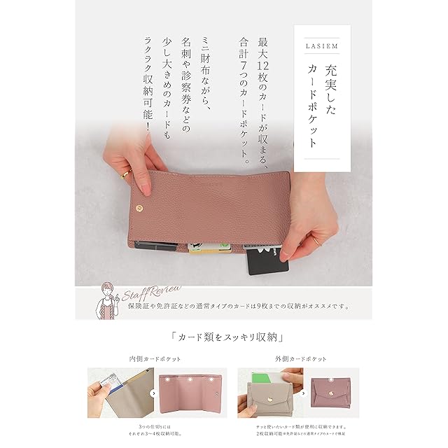 ✅【充実したカードポケット】最大12枚のカードが収まる、合計7つのカードポケット。 ミニ財布ながら、名刺や診察券などの少し大きめのカードもラクラク収納可能!