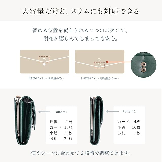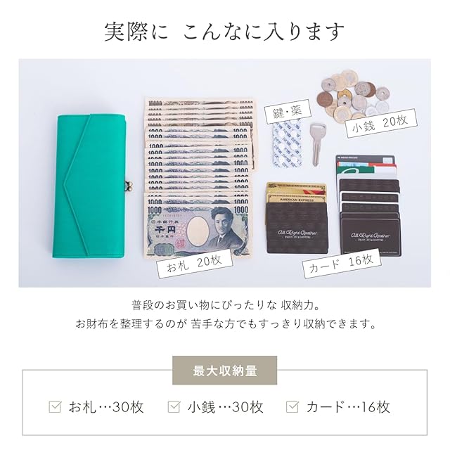 [スペック] ・お札入れ × 1・フリーポケット × 2 ・小銭入れ × 2 ・カードポケット × 16 [推奨収納上限] ・お札 × 30枚 ・小銭 × 30枚 ・カード × 16枚
